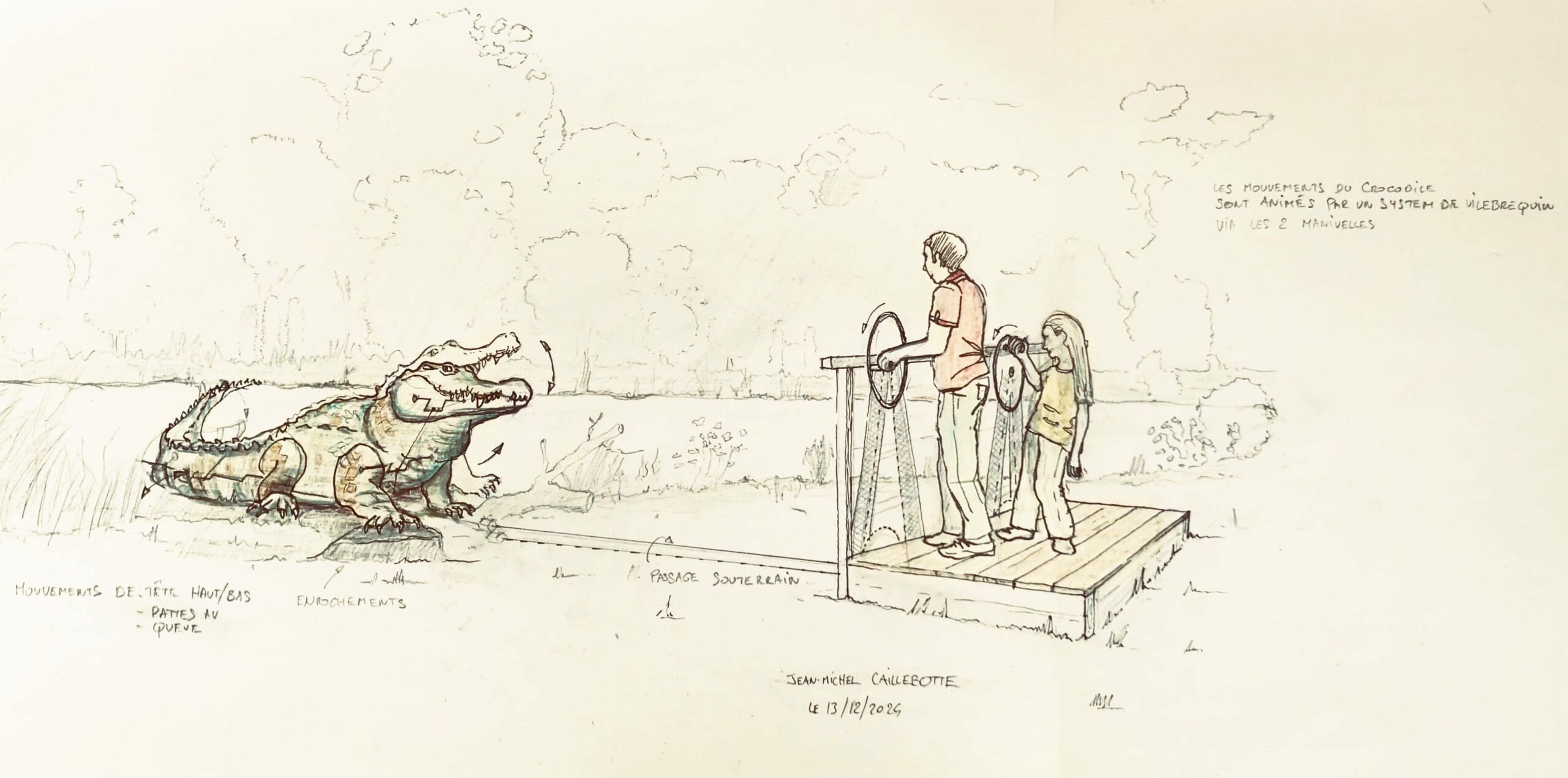 “Le Crocodile est né du hasard des rivages. En ramassant du chêne liège près de Collioure, j’ai vu apparaître, peu à peu, la silhouette d’un animal endormi, Mais je ne voulais pas d’une créature muette à admirer, mais d’un être réveillé par le geste du visiteur. Le Crocodile que je propose est une sculpture mécanique vivante que l’on active. Il est un miroir de nos contradictions : fascination et peur, domestication et désir sauvage”.